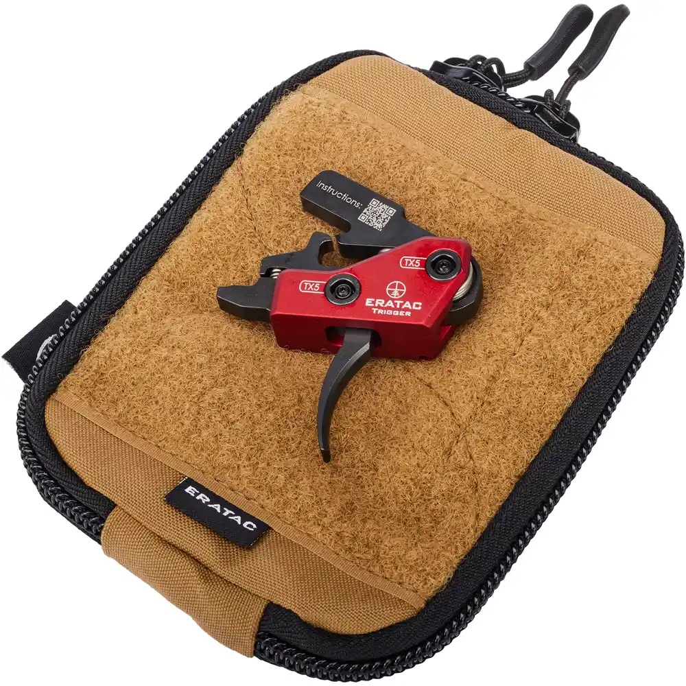 Era-Tac Trigger mit gebogenem Züngel für AR-15/10. Um den „Real Drop In“ Abzug einzubauen, muss weder die Waffe noch der Abzug zerlegt werden. Zum Transport der Waffe kann der Abzug mit wenigen Handgriffen entnommen werden. Das Abzugsgewicht kann mittels vordefinierten Rastungen zwischen >1000 g und >1500 g umgestellt werden. Es ist kein langwieriges Justieren erforderlich.