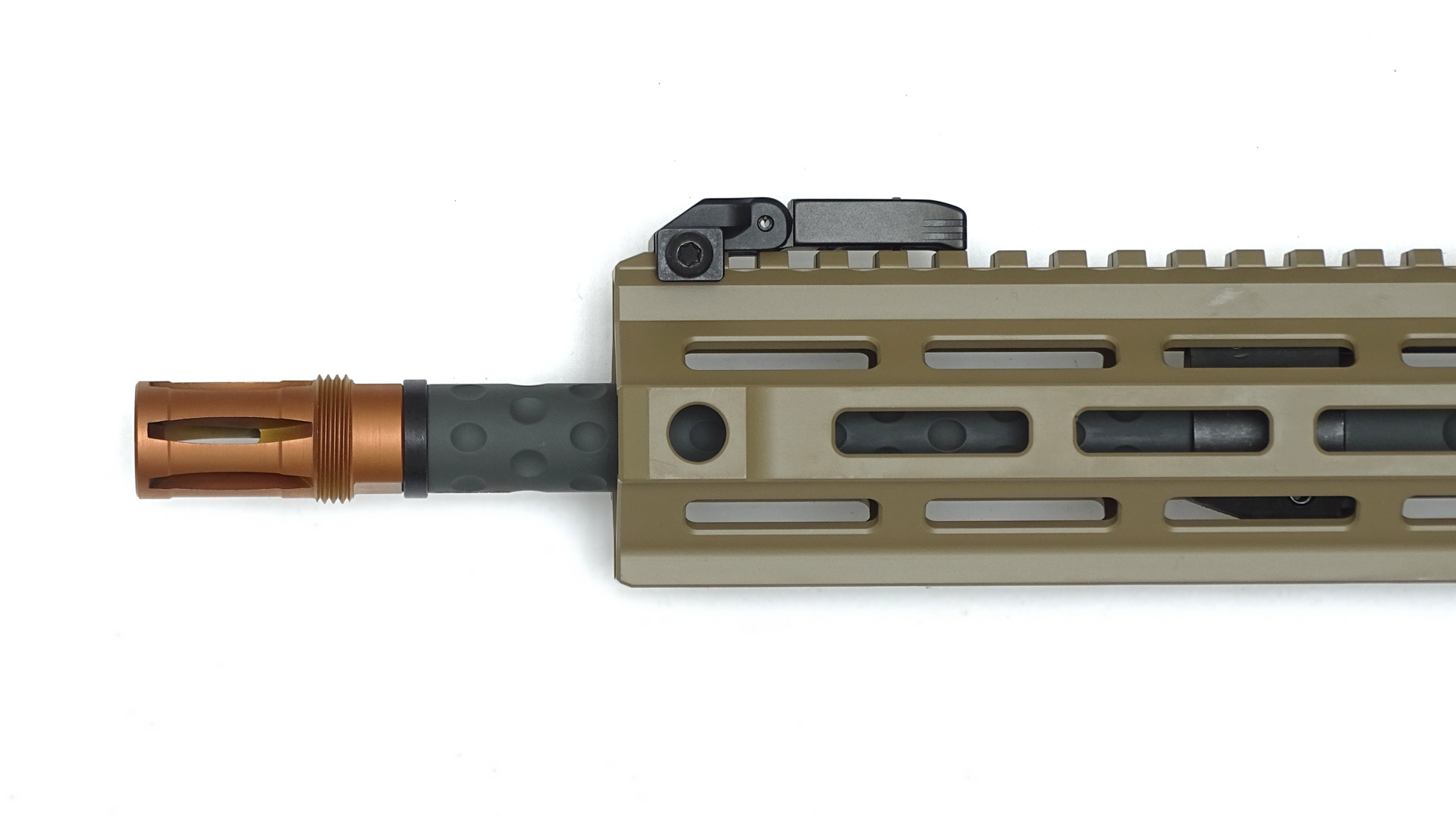 - 14" OA MDR light Vorderschaft mit M-LOK Schnittstellen und druchgehender Picatinny Toprail und kurzer Picatinnyschine vorne rechts. Beschichtung Cerakote Coyote Tan