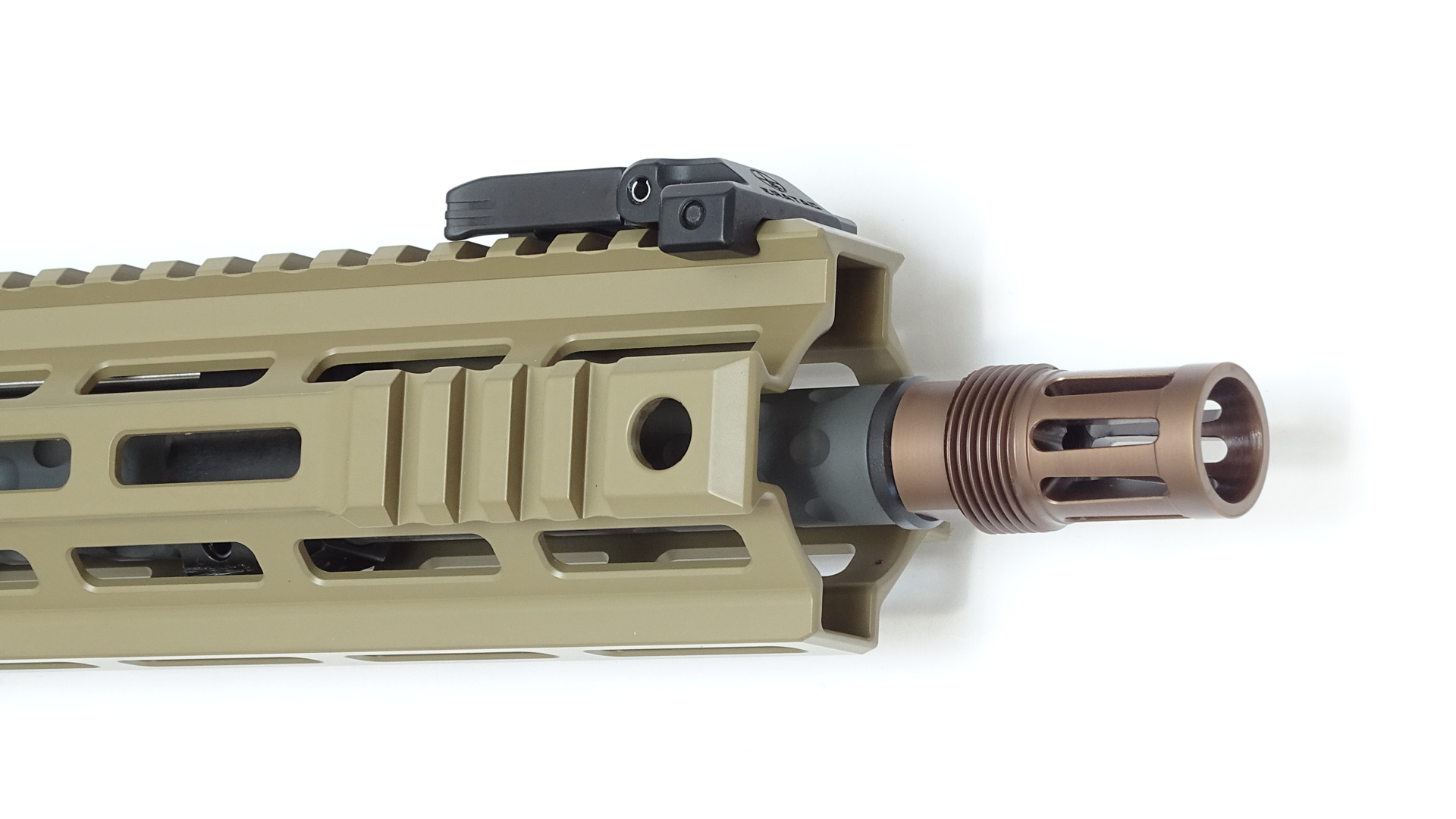 - Verschluss und KDA Mündungsfeuerdämpfer Kupferfarben PVD beschichtet 11.5 OA MDR light Vorderschaft mit M-LOK Schnittstellen und druchgehender Picatinny Toprail und kurzer Picatinnyschine vorne rechts. Beschichtung Cerakote Coyote Tan