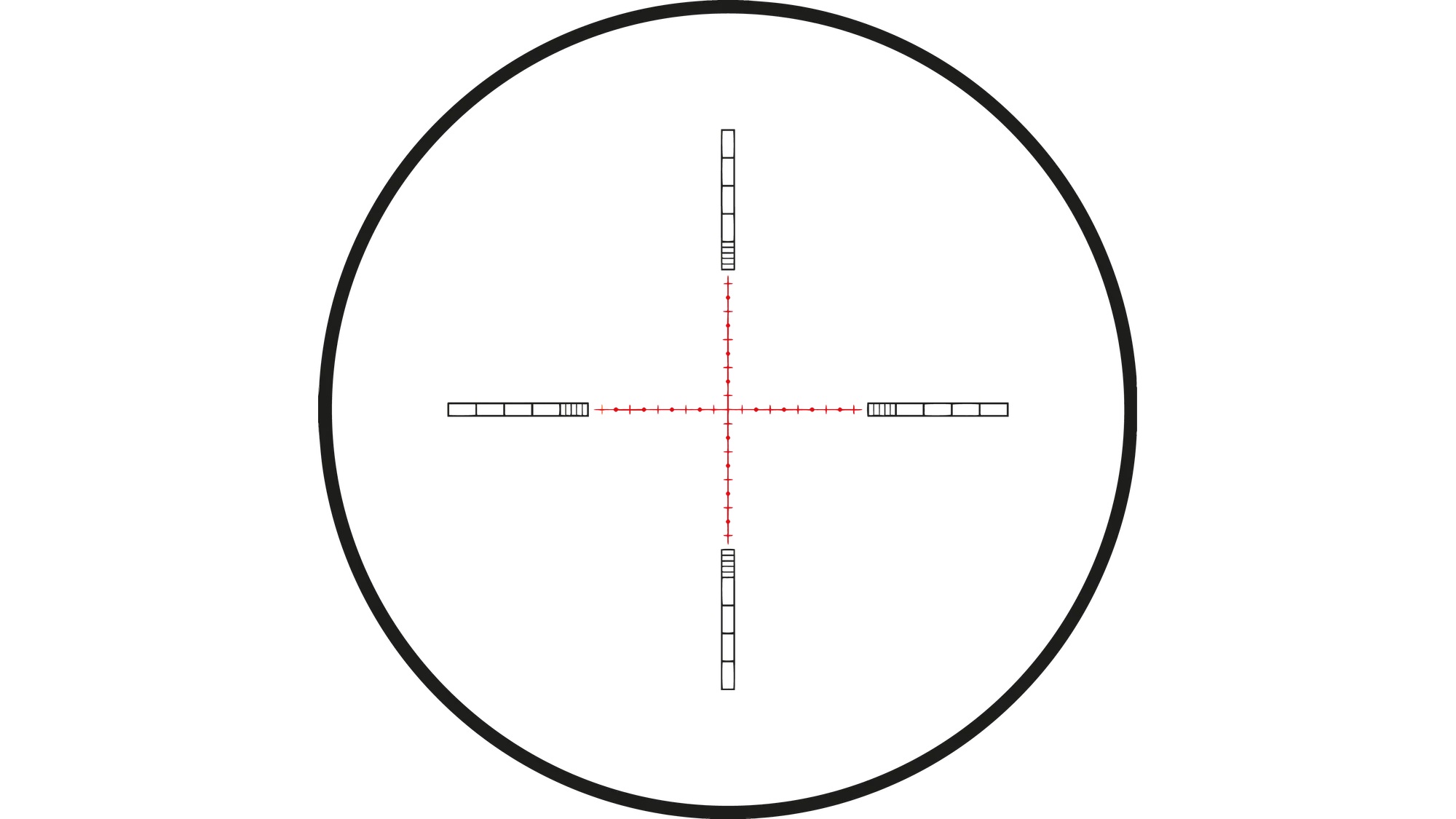 Das Mil-Absehen in der ersten Bildebene (First Focal Plane, FFP) baut auf den gängigen Prinzipien für Absehen mit Mil-Abstand auf. Mit Markierungen im Halb-Mil-Abstand außerhalb von 5 Mil in allen Richtungen ist das FFP Half Mil Dot ein vielseitiges Absehen, das selbst unter extremsten Bedingungen Zielpunkte bietet. Die Hohllinien sind in Mil-Abstände und 0,2-Mil-Abstände unterteilt, so dass sie für Entfernungsmessung benutzt werden können. Das Absehen im Mil-Abstand und die 1⁄10 MRAD-Verstelltürme ermöglichen eine einfache Zielpunkteinstellung. Jeweils 10 Verstellschritte an dem Verstellturm entsprechen genau 1 Mil-Abstand auf dem Fadenkreuz. Aufgrund der ersten Bildebene gilt dies für alle Vergrößerungen.