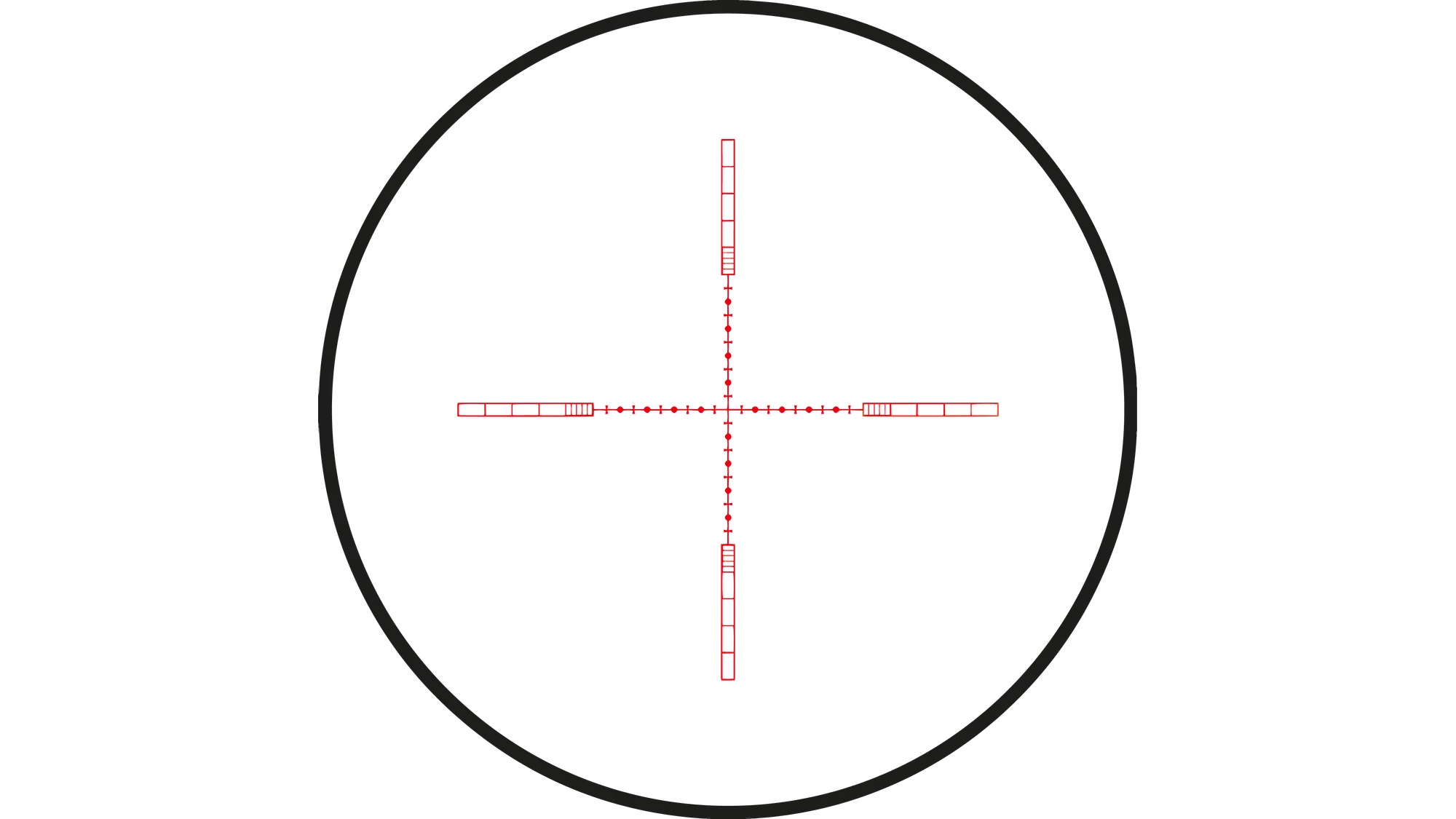 10× ½ Mil Dot Absehen. Mil-Dot Skala bei 10fach Vergrößerung. Zwischen- markierungen im 1⁄2 Mil Abstand für präzisere Haltepunkte. In Glas geätzt, frei schwebend.