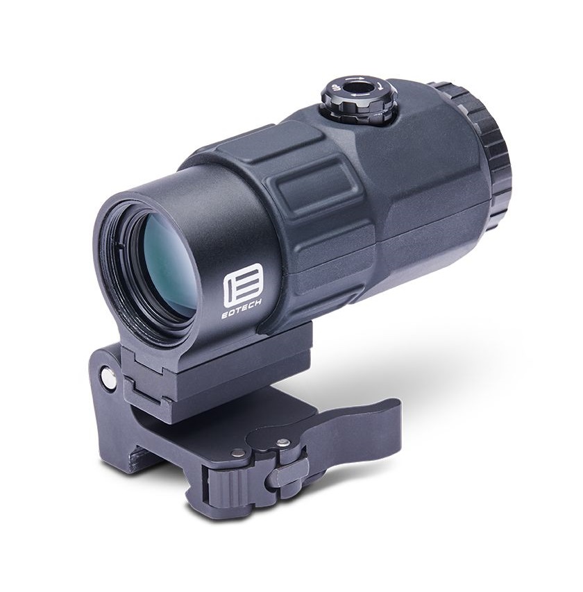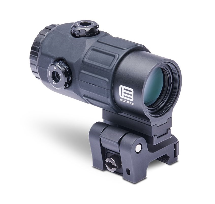 Der EOTech G45 Magnifer bietet mit seiner 5fachen Vergrößerung und den identischen Abmessungen zum G33 eine nochmals verbesserte Präzision auf längeren Distanzen. Wie beim Eotech G33, 43 verfügt auch das Eotech G45 über eine Switch to Side Montage, die es dem Schützen erlaubt schnell zwischen einer 1-fachen und 3-fachen Vergrößerung zu wechseln. Trotz 5-facher Vergrößerung bietet das G45 einen angenehmen Augenabstand von 67 mm.