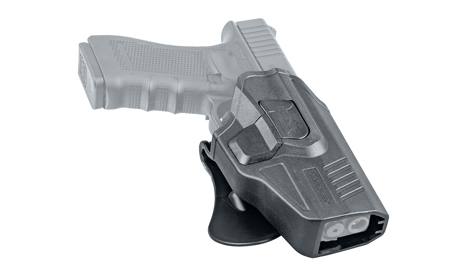 Umarex Polymer Paddle Holster Compact für Glock 17/19 etc., mit seitlichem Release-Button.