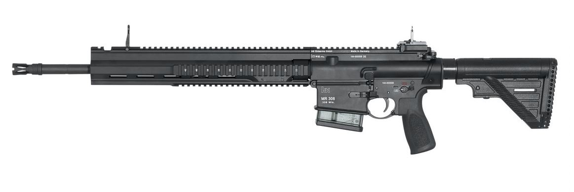Heckler & Koch setzte mit dem Konzept HK MR 308-A3 zahlreiche technische Forderungen um, die unmittelbar aus der täglichen Einsatzerfahrung der Anwender stammen.Es bringt mit seinem Kaliber .308 Winchester nicht nur die nötige Reichweite und Durchschlagskraft – auch die Handhabung der Waffe wurde so ausgelegt, wie sie der Schütze bereits vom HK MR 223 oder von vergleichbaren Sturmgewehren gewöhnt ist.Durch die konsequente Fortführung des Baukastenprinzips erzielt das HK MR 308-A3 ein Höchstmaß an Flexibilität und Modularität. Das Resultat ist eine 100%ige Austauschbarkeit der Bauteile innerhalb des Waffensystems. Kaliberübergreifend ist der physikalisch maximal mögliche Anteil von Bauteilen mit dem HK MR 223 kompatibel. Gleichzeitig erlaubt das von Heckler & Koch patentierte freischwingende Handschutzsystem (MIL-STD-1913) dem Schützen absolute Freiheit bei der Wahl seines Sonderzubehörs. Im Gegensatz zu den herkömmlichen Stahlmagazinen setzt Heckler & Koch bei dem HK MR 308-A3 auf ein leichteres und sehr widerstandsfähiges Polymermagazin.Handschutz lang mit Klappkorn, Schnellvisier. Hinterschaft mit verstellbarer Wangenauflage und verstellbarem Schaftabschluss. Sonstige Ausführung wie MR 308-A3.