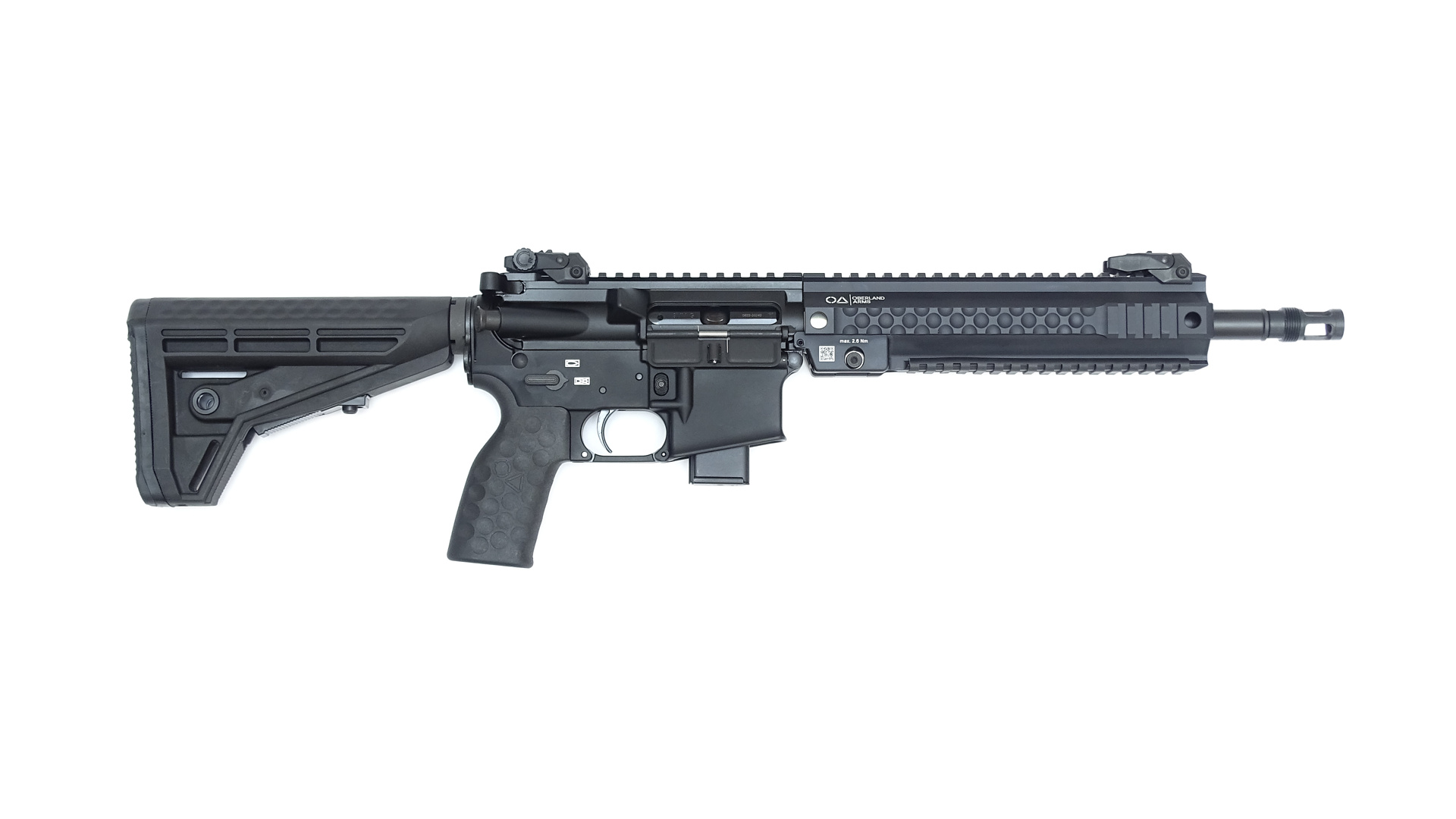 Oberland Arms OA-15 PR M9 Short 12" für Kurzwaffenpatronen. Das Gehäuseunterteil ist mit .223 Wechselsystemen kompatibel, d.h. zwei Kaliber mit nur einem Eintrag! Mit BKA Bescheid für das sportliche Schießen auch mit Harris Zweibein und Blast Deflector.