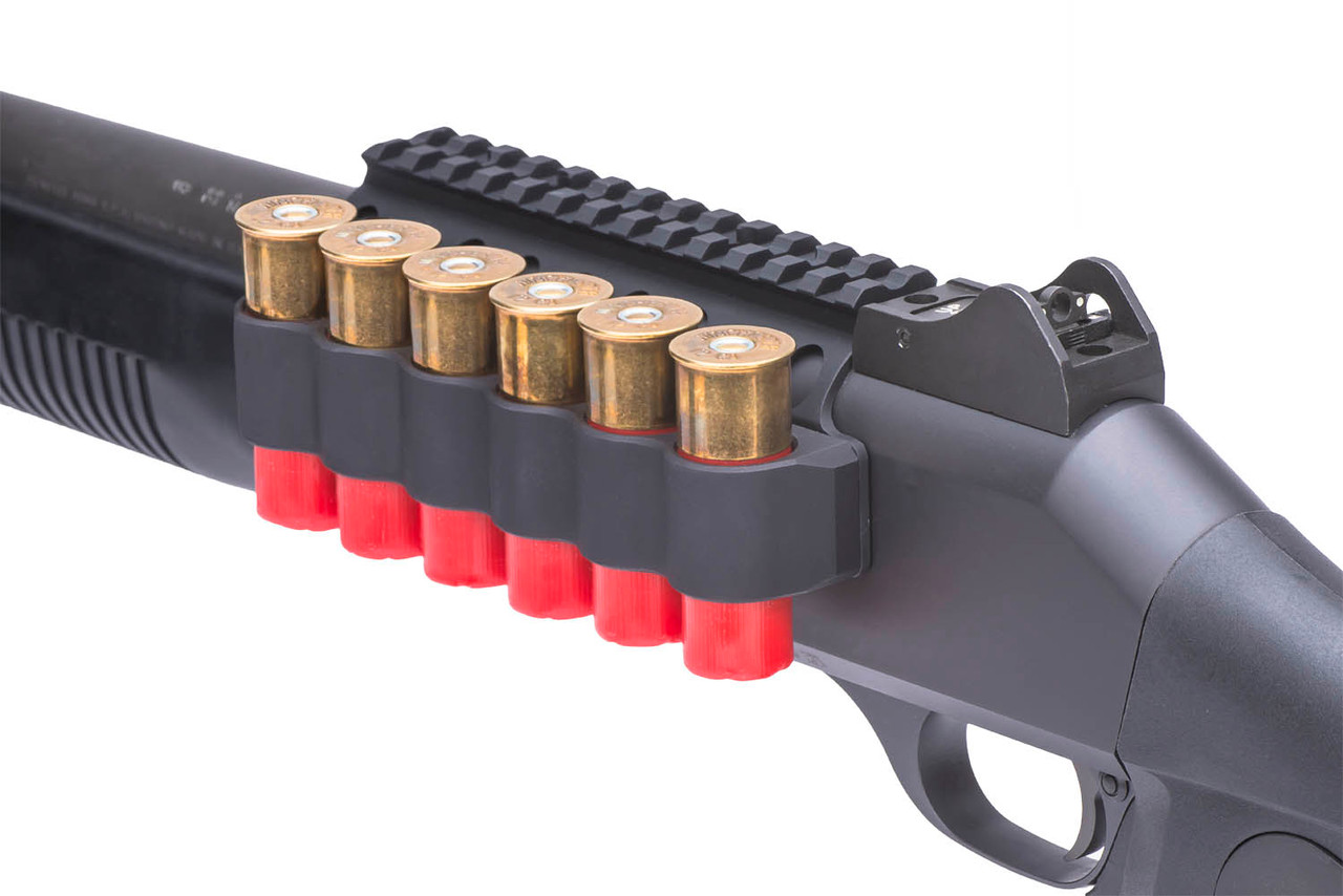 Mesa Tactical Benelli M4 SureShell Aluminum Schrotpatronenhalter für 6 Patronen mit Picatinny-Schiene. Die SureShell-Schrotpatronenhalter werden aus 6061-T6-Flugzeugaluminium gefräst, anschließend perlgestrahlt und nach Militärstandard hart eloxiert, um eine robuste, blendfreie Oberfläche zu erhalten. Der Halter wird auf dem Systemgehäuse verschraubt, und nicht wie bei anderen Herstellern verklebt.