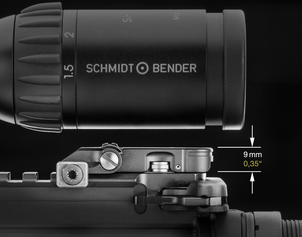 Durch sein ultraflaches Design mit einer Höhe von nur 9 mm / 0.35“ lässt sich das ERA-TAC-Notvisier auch unter extrem niedrig montierten Zielfernrohren verwenden.